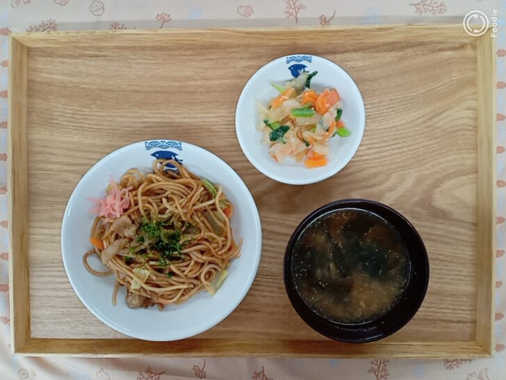 *焼きそば(豚肉、キャベツ、玉ねぎ、人参、青のり、生姜の梅酢漬け)