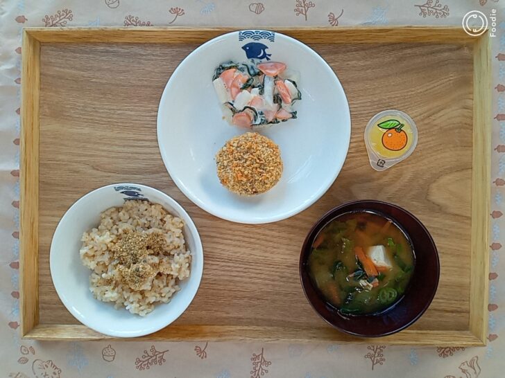 *五色の味噌汁(小松菜、人参、玉ねぎ、油揚げ、わかめ)