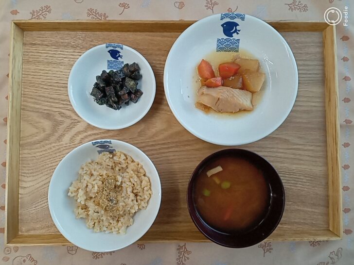 今日は里芋ご飯です。里芋は旬で、甘味がありホクホクねっとりした食感がご飯とよく合います。土の深くで育つ里芋はカリウムなどのミネラルが豊富で体のめぐりをよくします。
