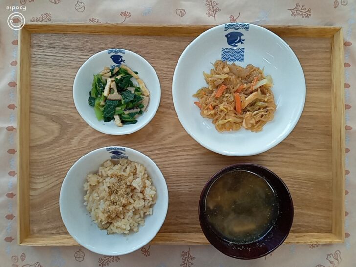 *春雨炒め(春雨、玉ねぎ、キャベツ、人参、干し椎茸、油揚げ)
