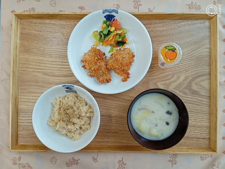 今日のチキンカツは「外がザクザクで中がふわふわ!」「とっても美味しい!」とお味見当番で感想を言ってくれました(*^^*)お味見当番のコメントも日々上達しています☆