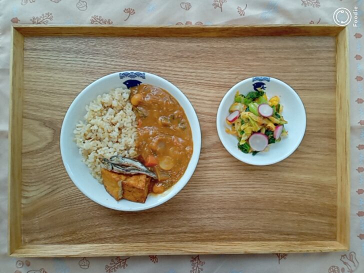 ひまわり組さんが収穫した大根や大根の葉が入ったカレーとラデッシュが飾られた人参ドレッシングサラダが出ました。ラデッシュは紫色が鮮やかでした(*^^*)野菜の味もとっても美味しくていつもよりもカレーもサラダもおいしかったです♪