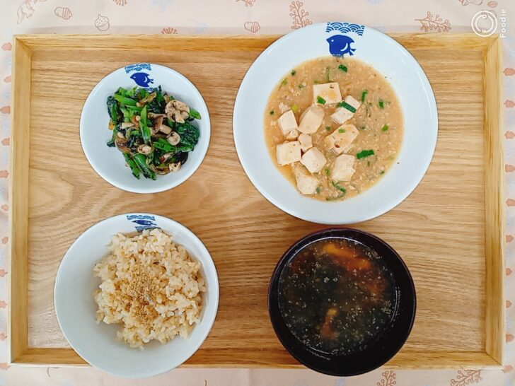 *麻婆豆腐(豆腐、大豆、玉ねぎ、青葱、生姜、にんにく、干し椎茸)
