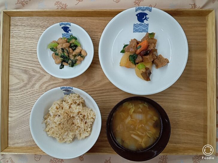 大根の車麩の煮物は車麩を油で素焼きして一緒に煮込みます。大きめに切った野菜を圧力鍋にかけて味が染みるようにやわらかくしました。一口をかじりとることも大切に、噛んだときにジュワ~ッと野菜の甘味が出てくることで噛むおいしさを味わってもらいたいと思っています。