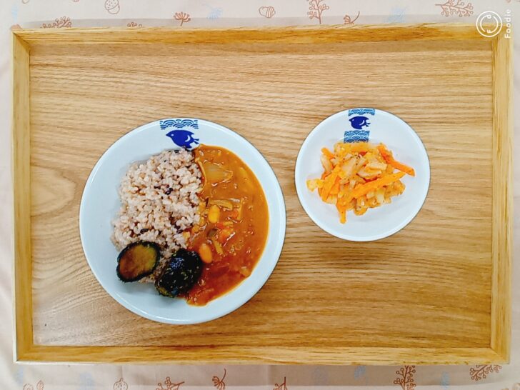 今日のカレーは秋が旬のきのこやお豆がたっぷり入っています。きのこの旨味やお豆の甘みでまろやかに仕上がりました。ご飯は黒米やアマランサスが入った秋にぴったりな雑穀ご飯でしたよ☆(^^)子どもたちは根菜たっぷりのサラダもたくさん食べてくれました!
