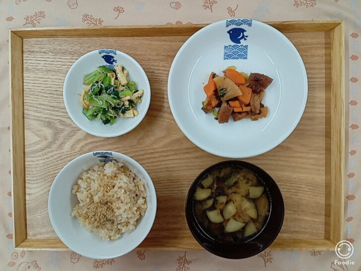 大根と車麩の煮物は冬のメニューです。レーズンと根菜の甘みが美味しい煮物です。葛粉で少し煮汁をとじてこっくりと仕上げます。寒くなってきたので、煮物を食べて身体の中から温まりたいですね(^^)