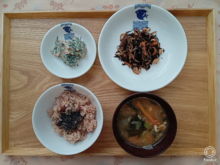今日は曇っていますが満月です。ひじき煮には「いりこ」と「大豆」が入っていて、いつものひじき煮よりも「カルシウム」がとれます。満月メニューを食べて身体の中をきれいに、骨も強くなれると良いです〇(^^)