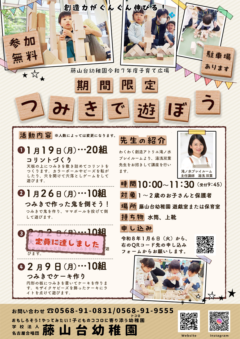 積み木の講師をお招きして「つみきで遊ぼう」のイベントを行います。